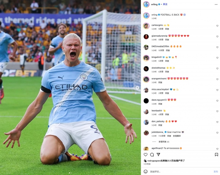8月17日,曼城在英超首轮4-0大胜狼队,赛后哈兰德在社交媒体发文:"足球回归了。"